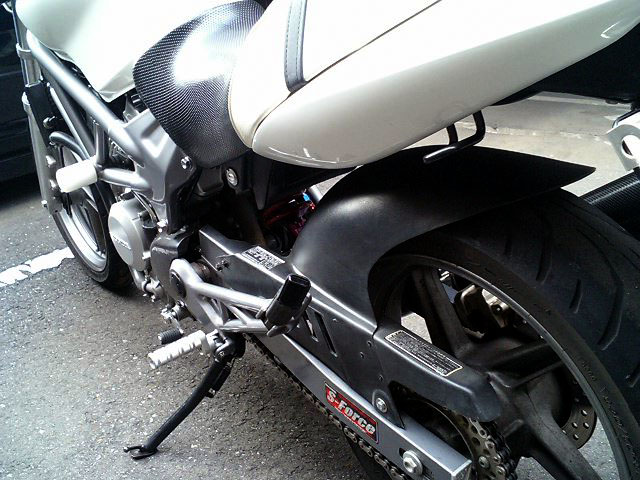 | リアインナーフェンダー (DIY) | Bandit250純正 リアインナーフェンダー流用 画像その2 その3 この車種では定番の流用カスタムなのですが、大抵は適当にタイラップ等で半端に固定しているようですが、しかし私はこだわりをもってVTR純正チェーンカバーと合体させ、オリジナルステーを作って全てをボルト&ナットでで固定しました。もちろんコーションもキレイに移植!シートに次ぐMy傑作Part2。 |